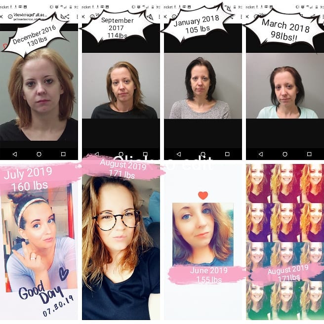 These images I’m sharing are hard to look at. What you are seeing is my downfall and my rise above through pictures. The top row is from December 2016 thorough March 2018! This was 27 months of pure hell and I still continued on for another 11, months making it a total of 34 months!!! The bottom row is just the last few months pictures from June – August! I started out with massive pain pill addiction from percacets to Roxy’s and During my most active addiction days I was a heavy Meth user. I battled with depression, suscide, and losing my children which was almost the death of me. I was down to 98 lbs and did not even know if I was going to live or die! I felt guilty, unloved, ashamed, and like I couldn’t find peace or a way out of the world I was living!